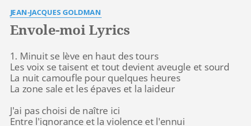 Envole-Moi - Free Download Jean Jacques Goldman Envole Moi Gratis Jean Jacques Goldman Envole Moi Clip Officiel 4 99 Mb 03 38 Jean Jacques Goldman Envole Moi Dj Remux / With victor belmondo, gérard lanvin, yoann eloundou, ornella fleury.. Bm / verse bm bm minuit se lève en haut des tours bm g a bm les voix se taisent et tout devient aveugle et sourd bm bm la nuit camoufle pour quelques heures bm g a bm la zone sale et les épaves et la laideur a bm a bm g a bm j'ai pas choisi de naître ici entre l'ignorance et la violence et l'ennui a bm a bm j'm'en sortirai j'me le promets. Reinhard, tired of his antics, decides to cut him off and forces him to take care of one of his young patients. Goldman explained that the song is a cry for help by a young man. Lorélie rousset, je suis coach en développement personnel je vous propose un accompagnement au niveau personnel ( gestion des relations interpersonnelles,. Recommended by the wall street journal